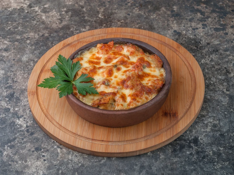 Запеченное филе красной рыбы в сметанном соусе с картофелем, спелыми томатами, луком и сыром сулугуни