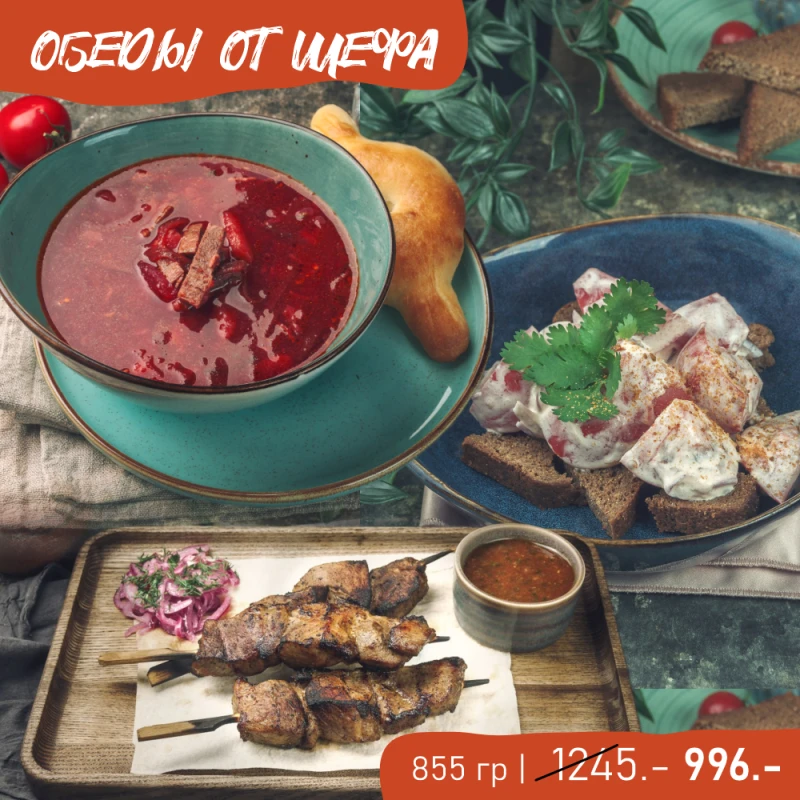 КОМБО-ОБЕД 3855 гКомбо из 3 блюд: Борщ с телятиной+сметана+грузинский шоти 300/50/80г, томаты со сванской солью, бородинским хлебом и сметаной 230г, шашлычки из свиной шеи+соус Сацебели 190/50г