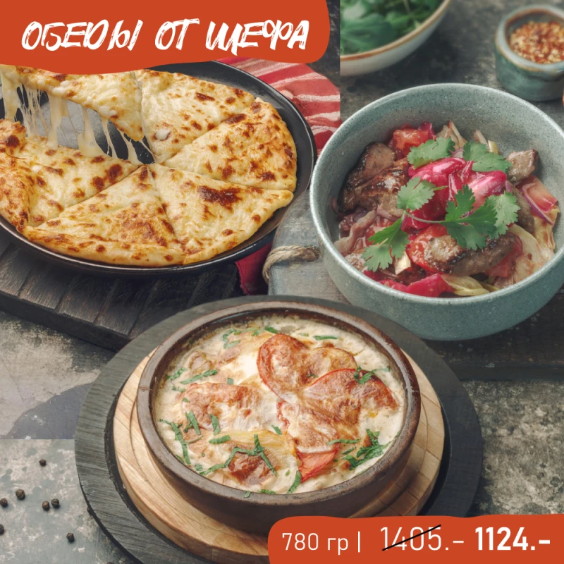 КОМБО-ОБЕД 4780 гКомбо из 3 блюд: Пиросмани с курицей 250г, салат с печенью кролика 230г, хачапури по-мегрельски 300г